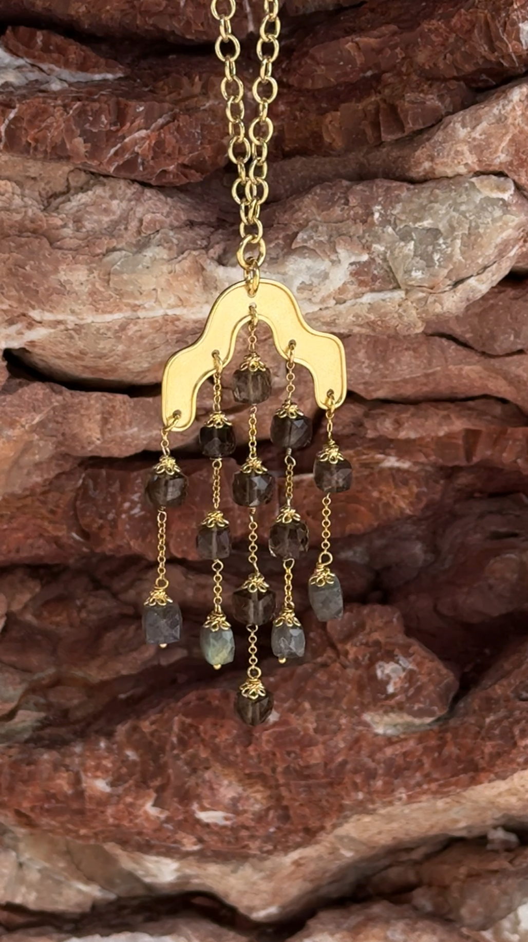 Zawieszka składa się z pięciu łańcuszków z labradorytem w kształcie fasetowanej kostki. Kamienie są przejrzyste w odcieniach szarości, brązu i zieleni odbijają światło w metalicznych kolorach. Nie ma dwóch identycznych egzemplarzy.